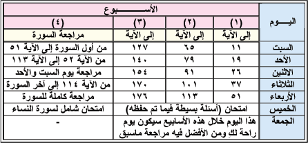 أم منو نه 8 أرسلي تقرير عن المشاركة قامت بالمشاركة 20 أبريل, 2009 السلام عليكــم ورحمـة الله وبركاتــة ،، حياكِ الله اختنا الفاضلة بيننا هذه صفحة تسميعك وهذه اختياراتك الاجزاء او السور التي اريد حفظها هي ان يتفضل الله سبحانه وتعالى ويمن علي بحفظ القران الكريم كاملا ان شاء الله تعالى ....السورة التي انوي البدء بها هي سورة النساء القراءة هي قراءة حفص عن عاصم لكن يرجى اختيار مستوى الحفظ فى سورة النساء ** جدول حفظ سورة النســاء ** وهي على ثلاثة مستويات فقط اختاري المستوى الذي ترغبين الحفظ وفقهُ .. المستوى الأول حفظ سورة النساء ومراجعتها خلال (4 أسبوع ) المقدار : صفحة كاملة (وجهين ) لكل يوم حفظ كما هو موضح بالجدول التالي.. المستوى الثاني حفظ سورة النساء ومراجعتها خلال (7 أسبوع ) المقدار : وجه واحد كل يوم حفظ كما هو موضح بالجدول التالي.. المستوى الثالث حفظ سورة النساء خلال (13 أسبوع ) المقدار : تقريباً نصف وجه لكل يوم حفظ كما هو موضح بالجدول التالي .. وكلما انهيت مقدار الحفظ تُخبرينا هنا أنكِ أنهيت حفظ يوم كذا ، إلى ان نصل ليوم الامتحان ونضع لكِ أسئلة التسميع روابط مساعدة المصحف المعلم برواية حفص للشيخ / محمود خليل الحصري المرتــــل القرآن الكريم -التدرب على حفظ الآيات عن طريق الكتابة وسماع المقاطع رتل - حفظ القرآن الكريم للشيخ / مشاري العفاسي ملحوظـة : أختي الحبيبة فضلاً يُرجى الحفظ عن طريق الاستماع لأحد القراء - كما في الروابط المساعدة - والترديد وراءه، وذلك لضمان سلامة نطقكِ وحفظكِ للآيات، فالأصل في حفظ القرآن الكريم أن يكون بالتلقي شارك هذه المشاركه رابط المشاركه شارك
