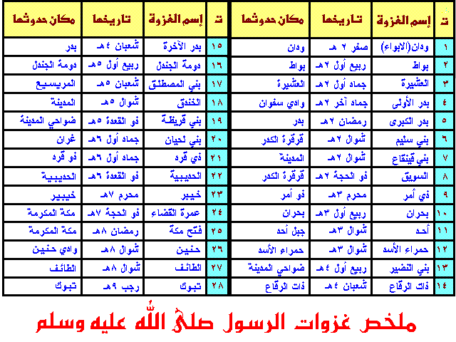 جدول ملخص غزوات لرسول صلى الله عليه وسلم