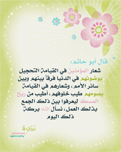 **الفقيرة إلى الله** 991 أرسلي تقرير عن المشاركة قامت بالمشاركة 3 يوليو, 2012 نعتذر على التأخر.. ** اليوم الثالث عشر من حملة المشمرات لاستقبال شهر الخيرات ** ~ درس اليوم: احذري ذا الوجهين احذري أختاه ذا الوجهين الذي يأتي هؤلاء بوجه، وهؤلاء بوجه، ولا يثبت على حال، وهذا شأن المنافقين، قال تعالى: {مُذَبْذَبِينَ بَيْنَ ذَلِكَ لَا إِلَى هَؤُلَاءِ وَلَا إِلَى هَؤُلَاءِ} [النساء: 143]. وقال النبي صلى الله عليه وسلم: «تجدون شر الناس عند الله يوم القيامة ذا الوجهين، الذي يأتي هؤلاء بوجه، ويأتي هؤلاء بوجه» [متفق عليه]. بمعنى أنه يمدح الإنسان في وجهه، ويبالغ في ذلك لقصد دنيوي، ثم في غيبته يذمه عند الناس، ويعيبه. ** ~ محاضرة اليوم: تمارين تدبر الجزء الثالث عشر من كتاب الله تأمل معاملة الله لأصناف الناس؛ لاسيما لمن انشغل به عن الناس ** ~ تذكير بعبادة وسنة يومية: ..• صيام التطوع •.. الإكثار من الصوم في شعبان؛ تربيةً للنفس واستعدادًا للقدوم المبارك، ويفضَّل أن يكون الصوم على إحدى صورتين: إما صوم النصف الأول من شعبان كاملاً، وإما صوم الإثنين والخميس من كل أسبوع مع صوم الأيام البيض. تقول أقرب الناس إليه وأحبها إلى قلبه أمُّنا عائشة رضي الله عنها وأرضاها في المتفق على صحته: ((ولم أره أكثر صيامًا منه في شعبان)) لم يكن يصوم صلى الله عليه وسلم من الأشهر ما يصوم من شعبان يستقبل به شهر الصيام والعبادة. قال ابن رجب رحمه الله : "صيام شعبان أفضل من صيام الأشهر الحرم ، وأفضل التطوع ما كان قريب من رمضان قبله وبعده". فكثير من الناس الذين لا يعرفون الصيام إلا في رمضان في أول أيام الشهر يصابون بدوخة، وبعضهم بإغماء، ويثقل عليهم الصيام لأنهم ما تعودوا عليه ولا رغبوا فيه، فهذه فرصة مباركة معاشر المؤمنين يقول أنس: ((ما كان صلى الله عليه وسلم يحرص على صيام قط مثل حرصه على صيام شعبان)). عن أسامة بن زيد رضي الله عنهما قال: قلت يا رسول الله: لم أرك تصوم من شهر من الشهور ما تصوم من شعبان؟ قال : ((ذاك شهر تغفل الناس فيه عنه، بين رجب ورمضان، وهو شهر ترفع فيه الأعمال إلى رب العالمين، وأحب أن يرفع عملي وأنا صائم)) [رواه النسائي]. ** ~ تذكرة: عن النبي صلى الله عليه وسلم قال: «صيام ثلاثة أيام من كل شهر صيام الدهر وأيام البيض صبيحة ثلاث عشرة وأربع عشرة وخمس عشرة» رواه النسائي وصححه الألباني. وتوافق الأيام البيض لهذا الشهر: يوم الإثنين الموافق 2/7/2012 ويوم الثلاثاء الموافق 3/7/2012 ويوم الأربعاء الموافق 4/7/2012 قال ابن القيم رحمه الله تعالى: "الصوم جنة من أدواء الروح والقلب والبدن؛ مَنافِعُه تفوت الإحصاء، وله تأثير عجيب: في حفظ الصحة، وإذابة الفضلات، وحبس النفس عن تناول مؤذياتها، ولاسيما: إذا كان باعتدال وقصد في أفضل أوقاته شرعاً، وحاجة البدن إليه طبعاً، ثم إنّ فيه من إراحة القوى والأعضاء ما يحفظ عليها قواها، وفيه خاصية تقتضي إيثاره، وهي تفريجه للقلب عاجلاً وآجلاً فهو أنفع شيء لأصحاب الأمزجة الباردة والرطبة وله تأثير عظيم في حفظ صحتهم". فاقبلي أخيتي الحبيبة على صيام هذه الأيام ولا تنسي الدعاء للمسلمين كافة.. بارك الله فيكِ وجعلكِ هادية مهتدية. وإليك الآتي : :: الأيــــــــام البيــــــــض:::: صيام ثلاث كل شهر هل يجب أن يكون في الأيام البيض؟:: ** ~ فتوى تهمكِ: حكم تأخير غسل الجنابة إلى طلوع الفجر سؤال: هل يجوز تأخير غسل الجنابة إلى طلوع الفجر، وهل يجوز للنساء تأخير غسل الحيض أو النفاس إلى طلوع الفجر؟ الجواب: إذا رأت المرأة الطهر قبل الفجر، فإنه يلزمها الصوم، ولا مانع من تأخيرها الغسل إلى بعد طلوع الفجر، ولكن ليس لها تأخيرها إلى طلوع الشمس بل يجب عليها أن تغتسل، وتصلي قبل طلوع الشمس. وهكذا الجنب ليس له تأخير الغسل إلى ما بعد طلوع الشمس بل يجب عليه أن يغتسل، ويصلي الفجر قبل طلوع الشمس، ويجب على الرجل المبادرة بذلك حتى يدرك صلاة الفجر مع الجماعة. [الشيخ ابن باز]. ** ~ بطاقتكِ: ** ~ ومضة: استعدي لإطعام المساكين وتفطير الصائمين وابدئي من الآن زيادة كمية ما تعدينه من طع