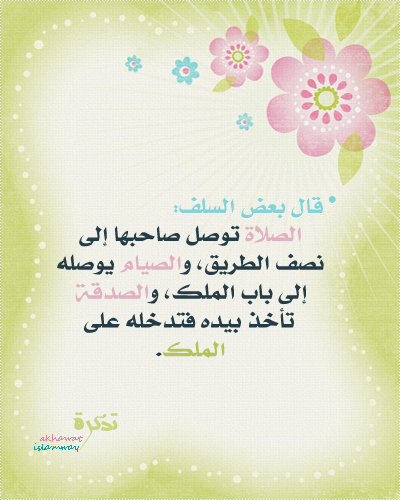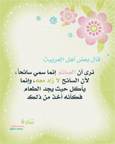 أمّ عبد الله 2425 أرسلي تقرير عن المشاركة قامت بالمشاركة 11 يوليو, 2012 ** اليوم الواحد والعشرون من حملة المشمرات لاستقبال شهر الخيرات ** ~ درس اليوم: ومن الإشارات التى تعينكِ على اغتنام فضائل رمضان, وإدراك كنوزه وجوائزه، وتحذركِ من التفريط والإضاعة ايضاً: رابعًا: رؤية الحكم والفوائد ولا بد للمسلم والمسلمة كذلك أن يعرفا شيئًا من حكم الصيام وفوائده، فإن ذلك من دواعي الاهتمام بهذه العبادة، وإيقاعها على الوجه المطلوب، ومن تلك الحكم والفوائد: 1- الصوم طريق لحصول التقوى، كما قال تعالى: {يَا أَيُّهَا الَّذِينَ آَمَنُوا كُتِبَ عَلَيْكُمُ الصِّيَامُ كَمَا كُتِبَ عَلَى الَّذِينَ مِنْ قَبْلِكُمْ لَعَلَّكُمْ تَتَّقُونَ} [البقرة: 183]. 2- وهو سبب للتخلص من كل أنواع الباطل: لقوله صلى الله عليه وسلم: «من لم يدع قول الزور والعمل به والجهل، فليس لله حاجة في أن يدع طعامه وشرابه» (رواه البخاري). 3- وهو يضعف الشهوة، ويعود على الصبر: ويقوي الإرادة، ولذلك أمر النبي صلى الله عليه وسلم من لم يستطع الزواج من الشباب بالصيام. 4- أنه يفرغ القلب، ويشغله بما يجلب له السعادة والفلاح: من الذكر والعبادة وتلاوة القرآن. 5- أنه يضيق مجاري الدم التي هي مجاري الشيطان، فتسكن النفس، ويهدأ البال، وتزول الوساوس، ويتفرغ الإنسان لطاعة ربه. 6- أنه يطهر الأمعاء, ويصلح المعدة، وينظف البدن من الفضلات التي قد تسبب الضرر مع الوقت. 7- تعويد الأمة على النظام والاتحاد وحب العدل والمساواة والإيثار والبذل والعطاء، ومواساة الفقراء والمساكين وأهل الفاقة. ** ~ محاضرة اليوم: تمارين تدبر الجزء الحادي والعشرين من كتاب الله إذا جاء شعبان غلقت أبواب الجدل، وفتحت أبواب العمل، وانهمر الفتح واتصل.. لن يتلذذ بالقرآن إلا المتدبرون.. فهيا يا تلاميذ التمارين ** ~ تذكير بعبادة وسنة يومية: ..• الصدقة •.. الصدقة من أفضل الأعمال وأحبها إلى الله عز وجل؛ ودليل ذلك حديث ابن عمر ـ رضي الله عنهما ـ مرفوعاً: "وإن أحب الأعمال إلى الله سرور تدخله على مؤمن، تكشف عنه كرباً، أو تقضي عنه ديناً، أو تطرد عنه جوعاً"، وحديث: "من أفضل العمل: إدخال السرور على المؤمن: يقضي عنه ديناً، يقضي له حاجة، ينفس له كربة". بل إن الصدقة لتباهي غيرها من الأعمال وتفخر عليها؛ وفي ذلك يقول عــمر بن الخطاب ـ رضي الله عنه ـ: "إن الأعمال تتباهى فتقول الصدقة: أنا أفضلكم". وهذه الرفعة للصدقة تشمل صاحبها؛ فهو بأفضل المنازل كما قال صلى الله عليه وسلم : "إنما الدنيا لأربعة نفر: عبد رزقه الله مالاً وعلماً فهو يتقي فيه ربه، ويصل فيه رحمه، ويعمل فيه حقاً فهذا بأفضل المنازل..." ، وهو صاحب اليد العليا كما أخبر بذلك النبي صلى الله عليه وسلم بقوله: "اليد العليا خير من اليد السفلى، واليد العليا هي المنفقة، واليد السفلى هي السائلة"، وهو من خير الناس لنفعه إياهم وقد جاء في الحديث المرفوع: "خير الناس من نفع الناس، وهو من أهل المعروف في الآخرة، ويدل على ذلك قوله صلى الله عليه وسلم : "أهل المعروف في الدنيا هم أهل المعروف في الآخرة". ولا تقتصر رفعة المتصدق على الآخرة بل هي شاملة للدنيا؛ فمن جاد ساد، ومن بخل رذل، بل قال محمد بن حبان: "كل من ساد في الجاهلية والإسلام حتى عرف بالسؤدد، وانقاد له قومه، ورحل إليه القاصي والداني، لم يكن كمال سؤدده إلا بإطعام الطعام وإكرام الضيف". فلا تبخلي على نفسك أختاه بالأجر.. فالصدقة لاتكلفك أقل شئ ،،،، تصدقي ولو بريال أو جنيه واحد كل يوم تكسبي دعوة ملك من السماء ينزلان كل ليلة فيقول الأول" اللهم أعط منفقا خلفا " ويقول الآخر " اللهم أعط ممسكاً تلفا ". تصــــــــــدقي ولو بالقليــل فالقليـــل عند الله كثيــــــــــر... ** ~ فتوى تهمكِ: استعمال الصائم للروائح العطرية سؤال: ما حكم استعمال الصائم للروائح العطرية في نهار رمضان؟ الجواب: لا بأس أن يستعملها في نهار رمضان, وأن يستنشقها، إلا البخور لا يستنشقه؛ لأن له جرماً يصل إلى المعدة، وهو الدخان. [الشيخ ابن عثيمين]. ** ~ بطاقتكِ: ** ~ ومضة: استمعي إلى الأشرطة