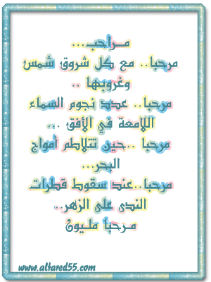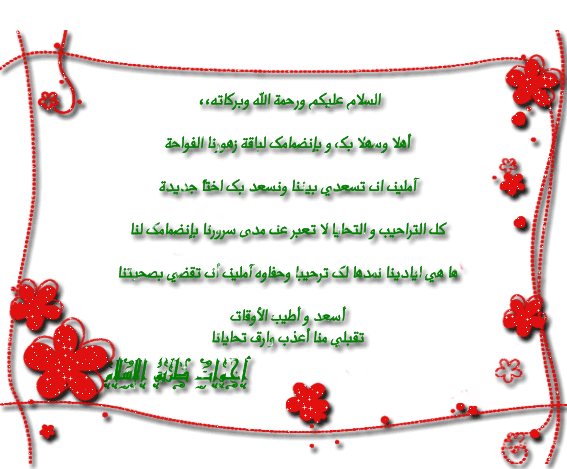 ريحانة من المغرب 0 أرسلي تقرير عن المشاركة قامت بالمشاركة 22 مارس, 2008 وعليكم السلام ورحمة الله وبركاته،، يا أهلا وسهلا بالأخت الفاضلة في منتدانا الغالي مع متمنياتنا لك بالافادة والاستفادة ان شاء الله واطلالة منورة واليك هده الهدية البسيطة النابعة من أعماق القلب شارك هذه المشاركه رابط المشاركه شارك